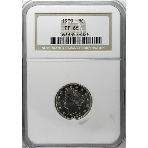 <B>1909 5C PR66 NGC.</B></I> The faintly toned surfaces have moderate to deep reflectivity. Well-preserved, though a tiny carbon speck is present in the left obverse field.<BR><BR><b>Shipping:</b> Coin/Currency (<a target="_blank" href="http://www.heritageauctions.com/common/shipping.php">view shipping information</a>)