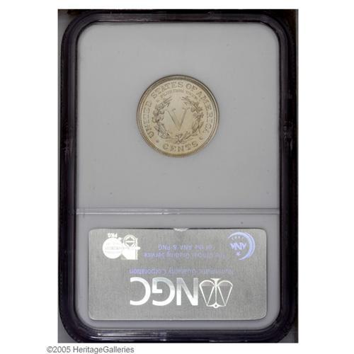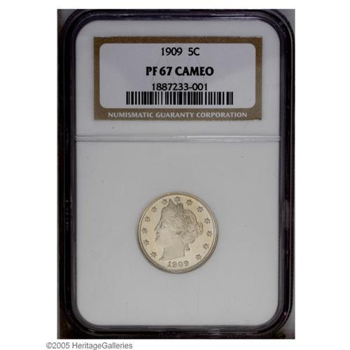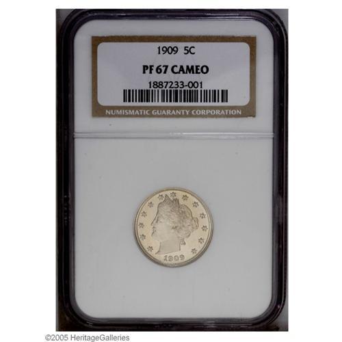 <B>1909<5C> PR67 Cameo NGC.</B></I> Although produced in larger numbers than most of its contemporaries, the quality of proof Liberty nickels from this year is especially high. This marvelous specimen does not disappoint in that regard, being well contrasted and exhibiting a thin veneer of light champagne patina on each side. The design features are exquisitely struck. Population: 22 in 67, 6 finer (9/05).