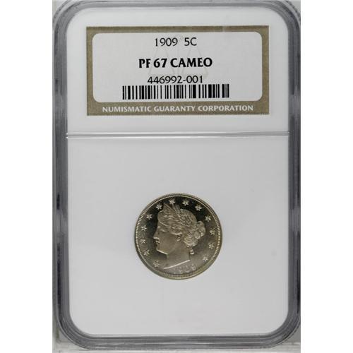 <B>1909<5C> PR67 Cameo NGC.</B></I> There could be little dispute over the cameo designation awarded to this carefully preserved specimen. The sparkling surfaces display a thin coating of golden patina and possess dramatic contrast between the fields and the devices. Census: 20 in 67, 5 finer (5/06).