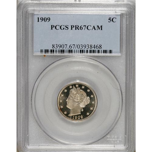 <B>1909 5C PR67 Cameo PCGS.</B></I> A light golden cast visits the fields on each side of this basically untoned specimen, which features excellent field-device contrast and a premium appearance. The proof mintage for this year of 4,763 pieces was considerably larger than the surrounding years due to the introduction of the Lincoln cent in 1909, which resulted in increased demand for the minor proof sets. Population: 9 in 67 Cameo, 0 finer (3/07).<BR><BR><b>Shipping:</b> Coins & Currency (<a target="_blank" href="http://www.heritageauctions.com/common/shipping.php">view shipping information</a>)