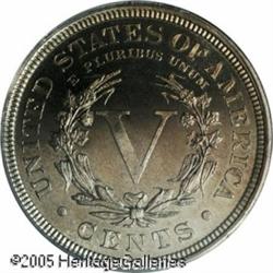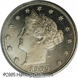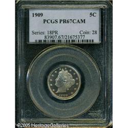 <B>1909 5C PR67 Cameo PCGS.</B></I> Although produced in larger numbers than most of its contemporaries, the quality of proof Liberty Nickels from this year is especially high. This well contrasted specimen does not disappoint in that regard, being well contrasted and exhibiting splashes of light golden-orange patina on each side. Population: 8 in 67 Cameo, 0 finer (1/05). Lot:5949