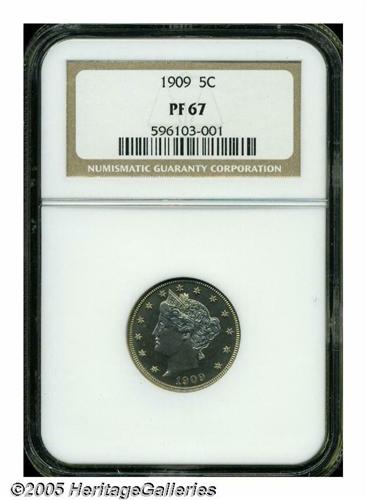 <B>1909<5C> PR67 NGC.</B></I> Fully struck and impeccably preserved, this beautiful Superb Gem displays deeply reflective fields and lovely variegated toning on both sides. The smooth proof surfaces seem pristine.
