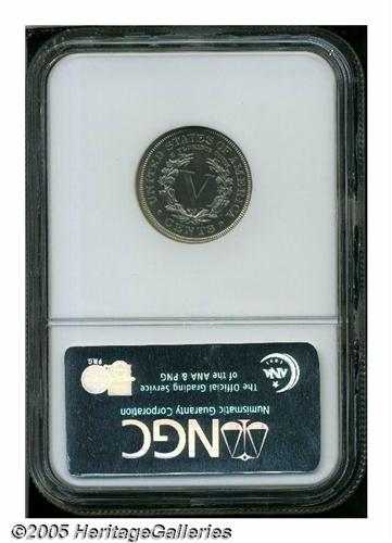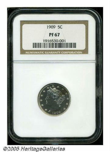 <B>1909<5C> PR67 NGC.</B></I> The heavily frosted motifs are nicely highlighted against the reflective fields. Sharply struck, with just a splash of light brown color at the top of Liberty's head that betray otherwise untoned surfaces. Population: 82 in 67, 6 finer (6/05).