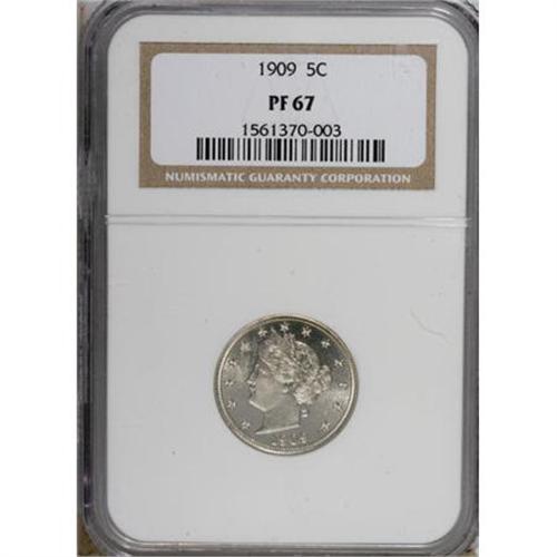 <B>1909 5C PR67 NGC.</B></I> Fully struck with glittering prooflike fields and bright untoned surfaces that yield a mild cameo-like effect on each side. This Superb Gem seems pristine, even under close inspection with a magnifier. Census: 85 in 67, 6 finer (6/07). <BR><BR><b>Shipping:</b> Coins & Currency (<a target="_blank" href="http://www.heritageauctions.com/common/shipping.php">view shipping information</a>)