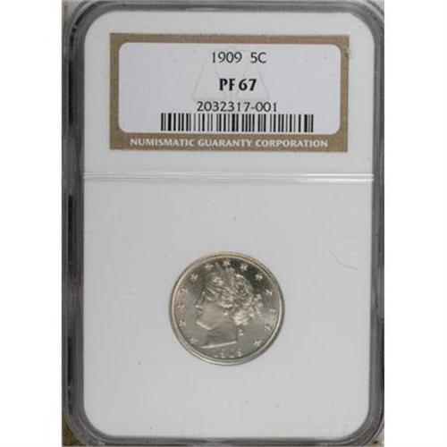 <B>1909 5C PR67 NGC.</B></I> Moderately mirrored and nearly untoned with traces of lilac haze on each nearly immaculate side. NGC has certified only six specimens finer (6/07).<BR><BR><b>Shipping:</b> Coins & Currency (<a target="_blank" href="http://www.heritageauctions.com/common/shipping.php">view shipping information</a>)