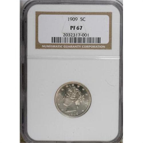 <B>1909 5C PR67 NGC.</B></I> Moderately mirrored and nearly untoned with traces of lilac haze on each nearly immaculate side. An exquisite Superb Gem specimen that soon will venture into antique territory. One of 4,763 pieces coined.<BR><BR><B>Coin Engraver:</B> Charles E. Barber<BR><BR><b>Shipping:</b> Coins & Currency (<a target="_blank" href="http://www.heritageauctions.com/common/shipping.php">view shipping information</a>)