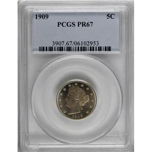 <B>1909 5C PR67 PCGS.</B></I> This issue's unusually high mintage of 4,763 pieces makes it popular with proof type collectors. This crisply struck Superb Gem has flashy luster beneath areas of rose-gold and orange patina. PCGS has graded just two finer examples.<BR><BR><B>Coin Engraver:</B> Charles E. Barber<BR><BR><b>Shipping:</b> Coins & Currency (<a target="_blank" href="http://www.heritageauctions.com/common/shipping.php">view shipping information</a>)