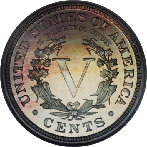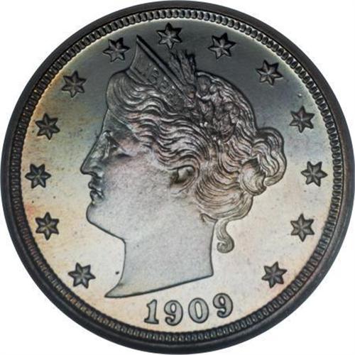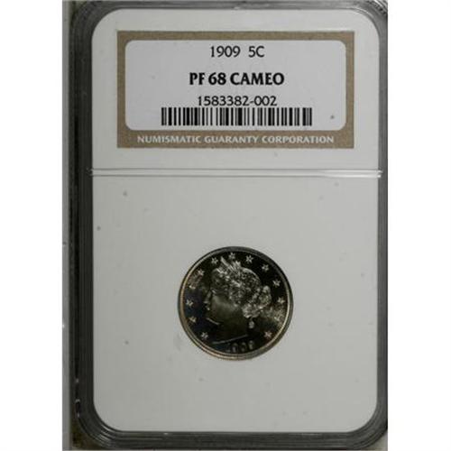 <B>1909 5C PR68 Cameo NGC.</B></I> Gorgeous accents of amber, rose, charcoal-gray and sea-green adorn the surfaces of this Superb Gem proof nickel. The denticles and devices are all fully and crisply struck, including the reverse left ear of corn. The fields display illimitable depths of mirrored reflectivity, and the central design elements are mildly frosted, inducing an attractive cameo effect on both sides. Census: 6 in 68 Cameo, 0 finer at either service (9/07). <BR><BR><b>Shipping:</b> Coins & Currency (<a target="_blank" href="http://www.heritageauctions.com/common/shipping.php">view shipping information</a>)