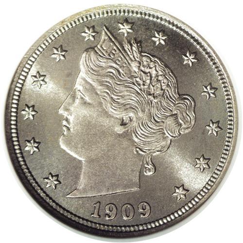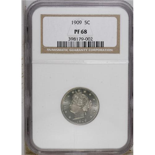 <B>1909<5C> PR68 NGC.</B></I> The design elements are sharply brought up, including nearly full definition on the corn ear and leaves to the left of the bowknot. A cameo-like effect results from the frosty motifs being highlighted against the fields. Subtle sky-blue and beige-gold patina overlays virtually pristine surfaces. Nearly 2,000 proofs have been certified by NGC and PCGS, but only eight have been assigned the lofty PR68 grade, with none finer (9/06).