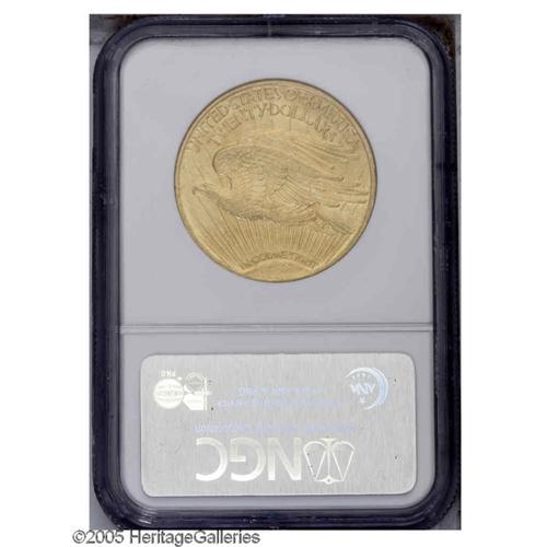 <B>1909/8<$20> AU53 NGC.</B></I> Light friction on the raised knee and on the eagle's breast confirms a brief encounter with circulation, although much luster persists. Yellow-gold surfaces reveal the expected assortment of bag marks, but none are overwhelming.