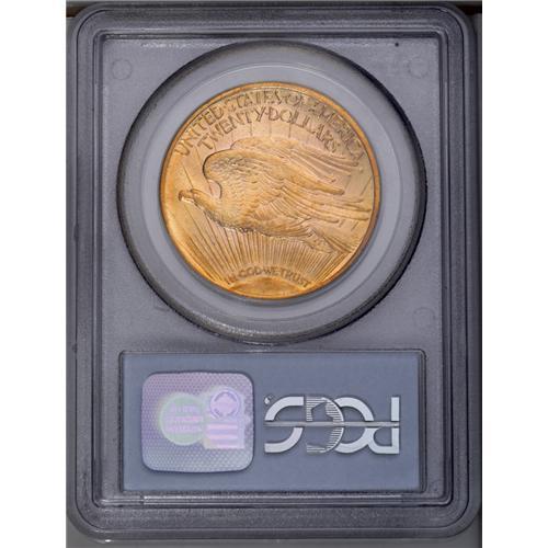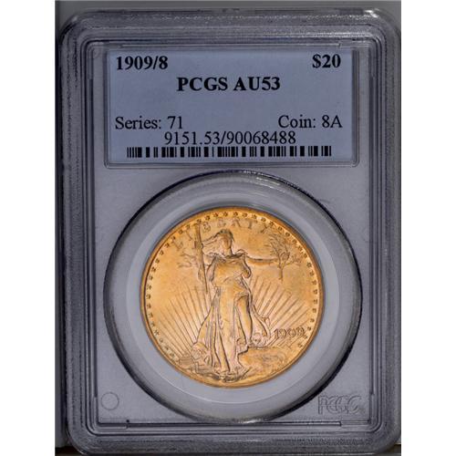 <B>1909/8<$20> AU53 PCGS.</B></I> A pleasing, lightly circulated example of this popular overdate. The orange-gold surfaces retain plenty of luster and have relatively few handling marks.