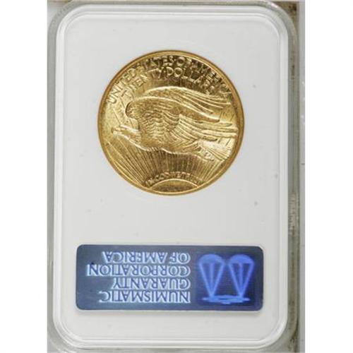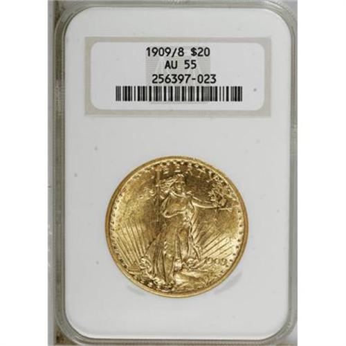 <B>1909/8 $20 AU55 NGC.</B></I> Liberty's knee and chest show slight wear, but the cartwheel luster is impressive for the grade, and any marks are unimportant for the grade. The 1909/8 is a dramatic mint error that divides an already low-mintage issue into two different <I>Guide Book</B></I> varieties.<BR><BR><B>Coin Engraver:</B> Augustus Saint-Gaudens<BR><BR><b>Shipping:</b> Coins & Currency (<a target="_blank" href="http://www.heritageauctions.com/common/shipping.php">view shipping information</a>)