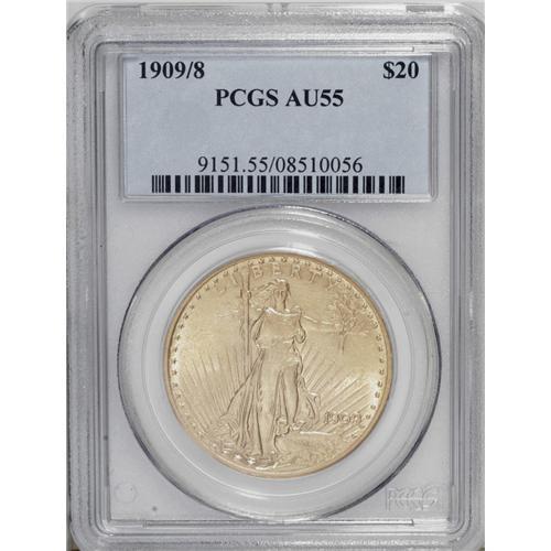 1909/8 $20 AU55 PCGS. Along with the 1942/1 dime, the