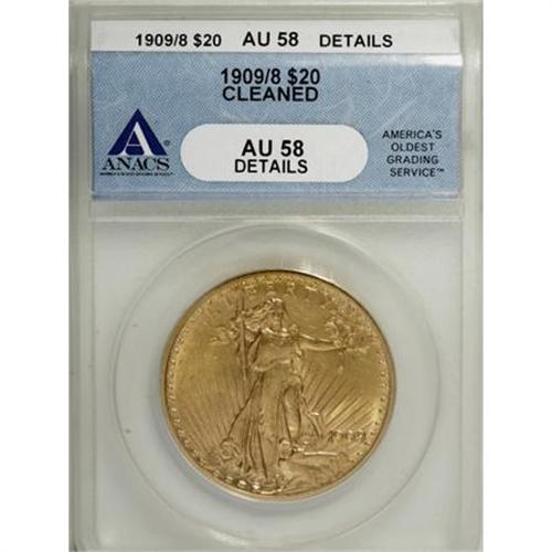 <B>1909/8 $20 --Cleaned--ANACS. AU58 Details.</B></I> NGC Census: (355/764). PCGS Population (299/1151). Numismedia Wsl. Price for NGC/PCGS coin in AU58: $925. (#9151)<BR><BR><B>Coin Engraver:</B> Augustus Saint-Gaudens<BR><BR><b>Shipping:</b> Coins & Currency (<a target="_blank" href="http://www.heritageauctions.com/common/shipping.php">view shipping information</a>)