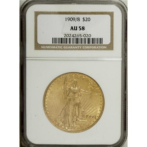 <B>1909/8 $20 AU58 NGC.</B></I> A hint of friction affects the highpoints on this luminous representative of the popular <I>Guide Book</B></I> overdate. Well struck with small, scattered marks in the fields.<BR><BR><b>Shipping:</b> Coin/Currency (<a target="_blank" href="http://www.heritageauctions.com/common/shipping.php">view shipping information</a>)