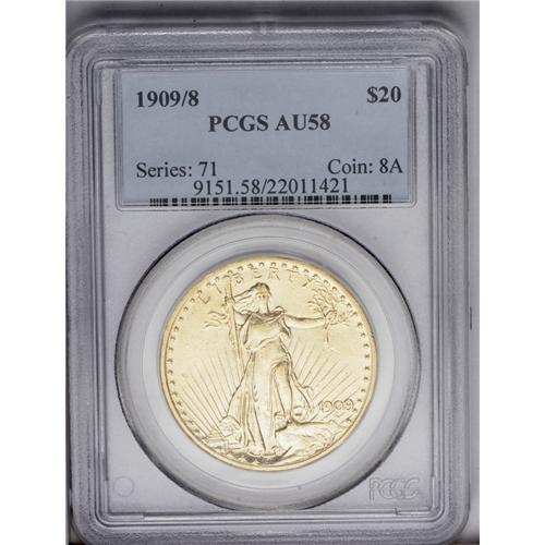 1909/8 $20 AU58 PCGS. A pretty, extremely lustrous exa 1909/8[$20] AU58 PCGS.