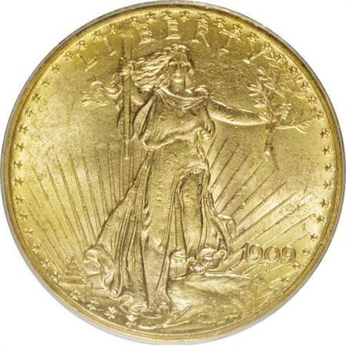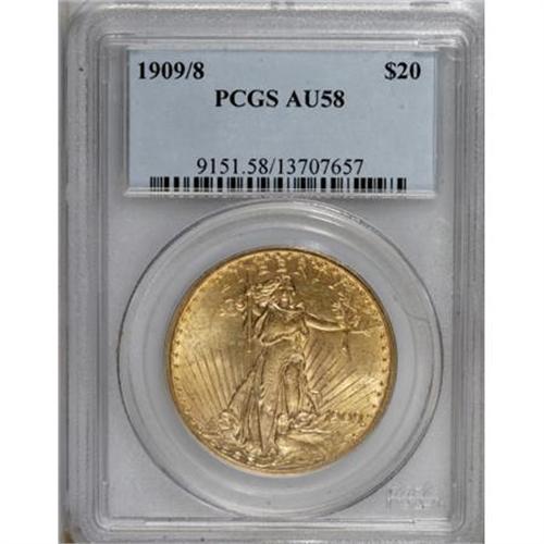 <B>1909/8 $20 AU58 PCGS.</B></I> PCGS Population (294/1111). NGC Census: (347/750). Numismedia Wsl. Price for NGC/PCGS coin in AU58: $925. (#9151)<BR><BR><B>Coin Engraver:</B> Augustus Saint-Gaudens<BR><BR><b>Shipping:</b> Coins & Currency (<a target="_blank" href="http://www.heritageauctions.com/common/shipping.php">view shipping information</a>)