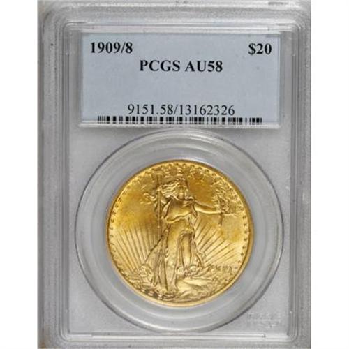 <B>1909/8 $20 AU58 PCGS.</B></I> A strongly lustrous example of this <I>Guide Book</B></I> overdate with areas of sun-gold and orange-gold in the fields. Minimally marked and attractive, though friction is present on Liberty's raised knee.<BR><BR><B>Coin Engraver:</B> Augustus Saint-Gaudens<BR><BR><b>Shipping:</b> Coins & Currency (<a target="_blank" href="http://www.heritageauctions.com/common/shipping.php">view shipping information</a>)