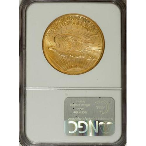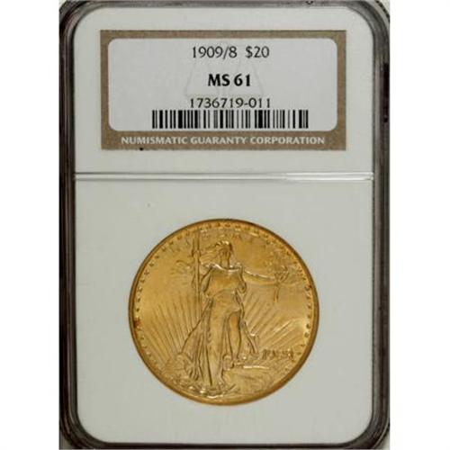 <B>1909/8 $20 MS61 NGC.</B></I> A flashy representative of this popular overdate. Well struck, with peach-gold, lightly abraded surfaces.<BR><BR><B>Coin Engraver:</B> Augustus Saint-Gaudens<BR><BR><b>Shipping:</b> Coins & Currency (<a target="_blank" href="http://www.heritageauctions.com/common/shipping.php">view shipping information</a>)