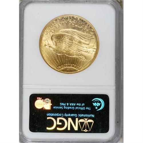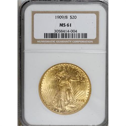 <B>1909/8 $20 MS61 NGC.</B></I> Lustrous surfaces display a khaki-gold cast and sharply defined design features. There is a scattering of light marks over each side, nevertheless, a visually appealing MS61.<BR><BR><B>Coin Engraver:</B> Augustus Saint-Gaudens<BR><BR><b>Shipping:</b> Coins & Currency (<a target="_blank" href="http://www.heritageauctions.com/common/shipping.php">view shipping information</a>)