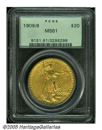 <B>1909/8<$20> MS61 PCGS.</B></I> Satiny and lightly toned, with a few minor contact marks. Scarce in Mint State and always popular as the only overdate variety of the Saint-Gaudens double eagle series.
