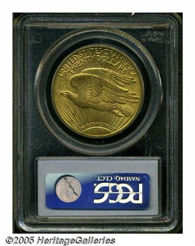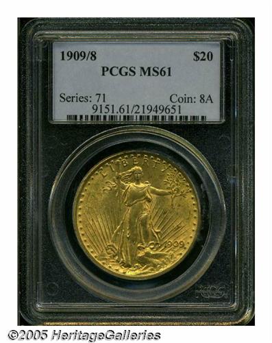 <B>1909/8<$20> MS61 PCGS.</B></I> his is the only overdate in the Saint-Gaudens Double Eagle series, and it is clear enough to see without magnification. Like its Normal Date counterpart, this is a scarce issue in all Mint State grades. David Akers noted: "The dies used were left over from the 1908 No Motto issues and so the 1909/8 has the same 'flat' look to the obverse that the other No Motto issues do." This is a pleasing example with attractive honey-gold color and sharp design elements. A few light contact marks are scattered over each side.