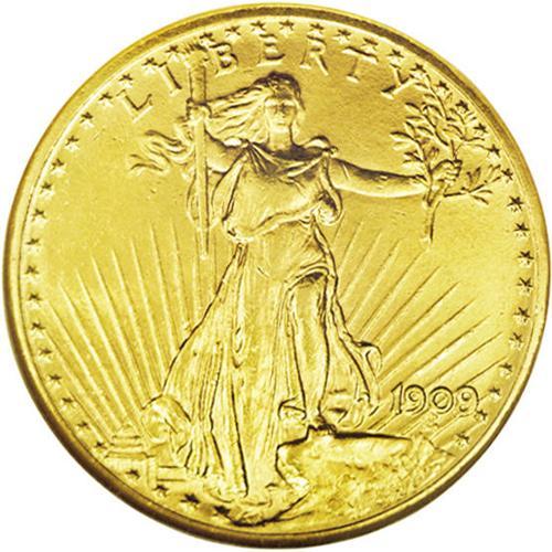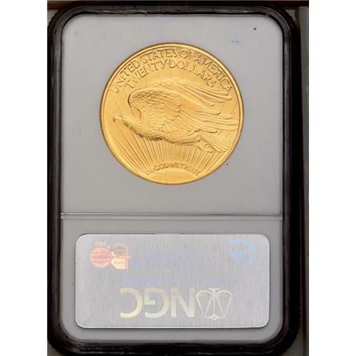 <B>1909/8<$20> MS62 NGC.</B></I> While the reverse is mostly distraction-free, there are numerous light abrasions on the obverse that prevent a higher grade. Potent luster radiates from both sides, with luscious green-gold surfaces and good overall eye appeal. The bold strike encompasses Liberty's sandal and the Capitol building, with just a bit of bluntness on her head.