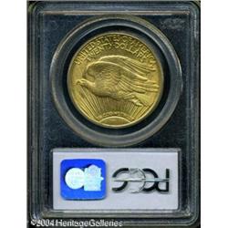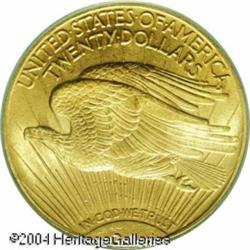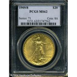 1909/8 $20 MS62 PCGS. A nicely preserved orange-go <B>1909/8 $20 MS62 PCGS.</B></I> A nicely preserved orange-gold specimen of this popular Saint-Gaudens Double Eagle overdate. The coin has good eye appeal and a typical amount of abrasions for the assigned grade. <BR><BR><B>Important notice:</B> Heritage usually auctions material at the rate of 200-250 lots per hour. On some occasions eBay Live bid software or the Internet may not be able to keep up with the pace of the auction. We recommend placing a realistic absentee bid now as insurance to avoid disappointment. Occasionally the auctioneer may eliminate or reject an eBay Live bid, and the auctioneer may also reopen a lot after the close of the eBay live bidding (usually because we missed an audience bid), and may reject your bid even if it shows you as the winning bidder. By bidding via eBay Live, you agree that Heritage may award the lot to another bidder at its sole discretion under the circumstances described above or any other reasonable circumstances. Since eBay bids are not shown to us until we open the lot on the floor, we treat those bids just like floor bids. In most cases the floor responds before the eBay bid is presented to us, due to Internet lag time, so for consistency we have made it a policy that floor bids are always considered first over tie eBay live bids. Also please note that all Heritage lots purchased through eBay Live carry a 20% Buyer's Premium. Please make sure you read the Terms and Conditions before you bid. This lot is being auctioned in conjunction with a live floor auction by Heritage Galleries & Auctioneers. All final auction and invoice information will be supplied by Heritage Galleries & Auctioneers, and all other information should be considered preliminary. Lot:7093