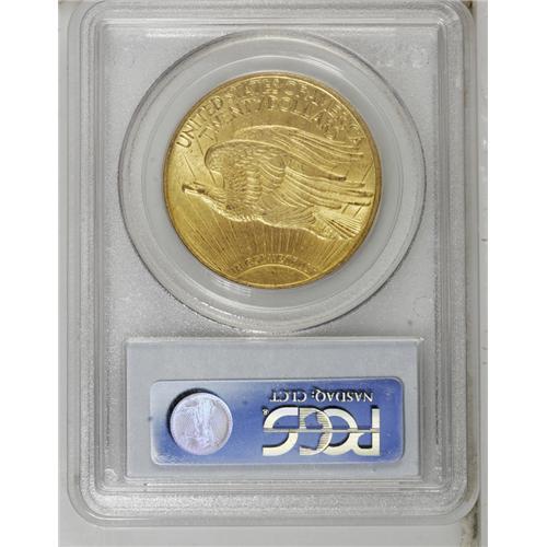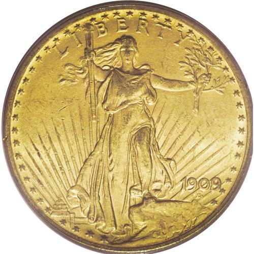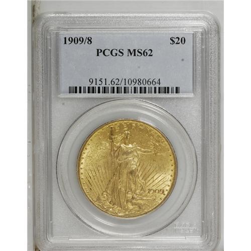 <B>1909/8 $20 MS62 PCGS.</B></I> A satiny example of this dramatic overdate. The mustard-gold surfaces exhibit distributed minor marks, but these are expected for the grade, and the reverse on its own is well preserved. The 1909/8 was saved in Mint State, but for its bullion content rather than numismatic value, and indifferent storage caused a paucity of better grade Uncirculated pieces.<BR><BR><b>Shipping:</b> Coin/Currency (<a target="_blank" href="http://www.heritageauctions.com/common/shipping.php">view shipping information</a>)
