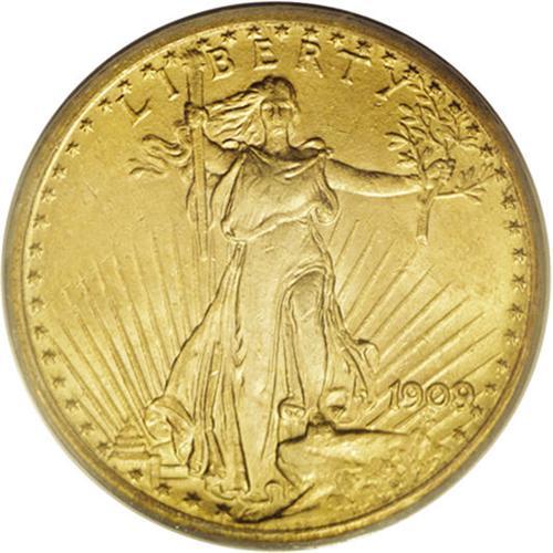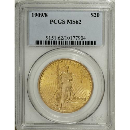 <B>1909/8 $20 MS62 PCGS.</B></I> The 1909 double eagles are about evenly split between regular-date and overdate varieties. The Mint State specimens encountered usually grade about MS62, like the present example, which boasts appealing honey-gold surfaces and brilliant luster. There are a few scattered, mostly light abrasions on the obverse, and the strike is a bit blunt on Liberty's head.<BR><BR><b>Shipping:</b> Coin/Currency (<a target="_blank" href="http://www.heritageauctions.com/common/shipping.php">view shipping information</a>)