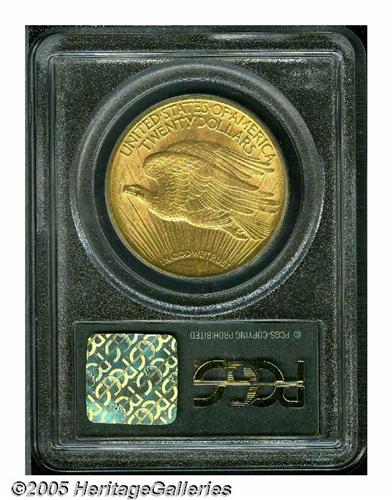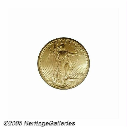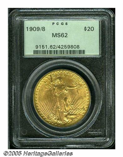 <B>1909/8<$20> MS62 PCGS.</B></I> This is one of just two 20th century gold overdates listed in the <I>Guidebook,</B></I> despite several others that were suggested by Walter Breen. The only other well-recognized variety is the 1901/0-S Half Eagle, one of very few branch Mint overdates in American numismatics. This one is fully lustrous and sharply struck with honey-gold color.<BR><I>From The Stig Ericsson Collection.</B></I>