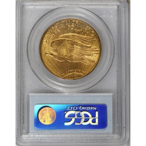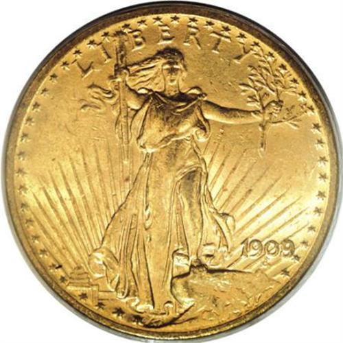 <B>1909/8 $20 MS62 PCGS.</B></I> The most prominent overdate of the double eagle denomination. The lower left curve of the 8 is unmistakable, and the variety has appeared in the Guide Book since its 1946 inception. This lustrous and suitably struck piece has the number of small marks associated with the MS62 level, but there is no individually mentionable contact.<BR><BR><B>Coin Engraver:</B> Augustus Saint-Gaudens<BR><BR><b>Shipping:</b> Coins & Currency (<a target="_blank" href="http://www.heritageauctions.com/common/shipping.php">view shipping information</a>)