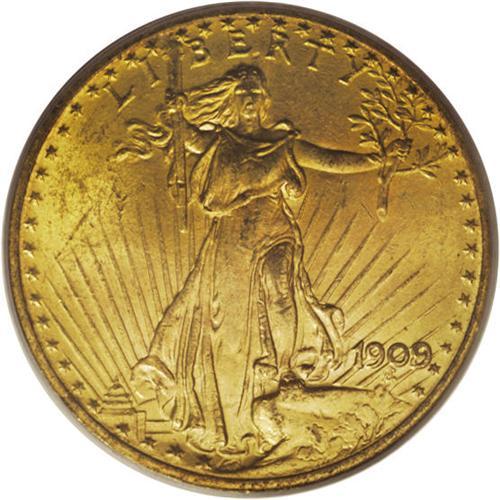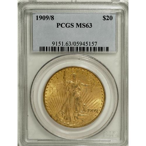 <B>1909/8 $20 MS63 PCGS.</B></I> Honey-gold surfaces are accented by faint traces of darker patina on the high points of each side. The overdate variety is popular with collectors, and examples are actively pursued regardless of grade. Examples in all of the various grades have their own following in today's numismatic arena.<BR><BR><b>Shipping:</b> Coins & Currency (<a target="_blank" href="http://www.heritageauctions.com/common/shipping.php">view shipping information</a>)