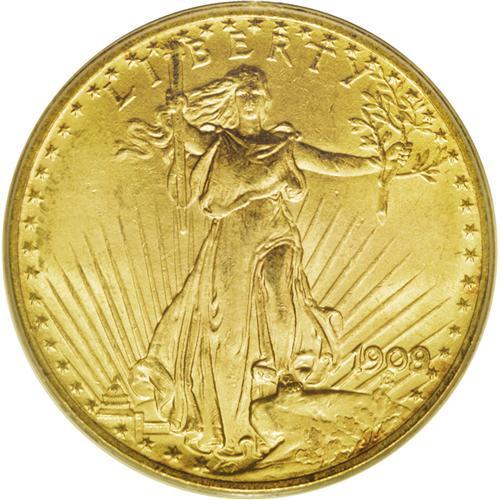 <B>1909/8 $20 MS63 PCGS.</B></I> The 1909/8 enjoys the distinction of being one of just two overdated gold coins produced in the 20th century. While fairly numerous in the various AU grades, Select or finer pieces are scarce and highly sought out by collectors. This satin-like representative is moderately abraded and generates considerable appeal from subtle orange accents.<BR><BR><b>Shipping:</b> Coin/Currency (<a target="_blank" href="http://www.heritageauctions.com/common/shipping.php">view shipping information</a>)