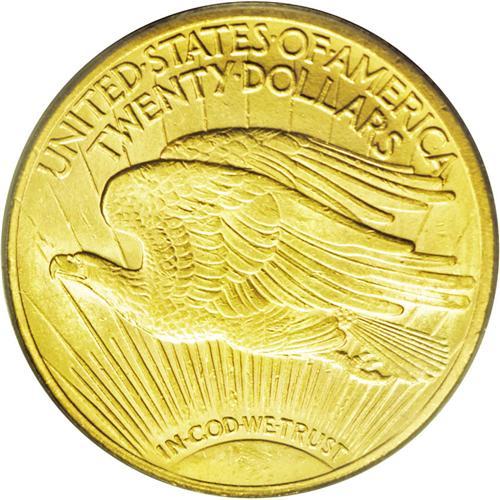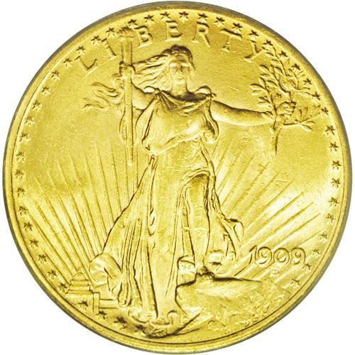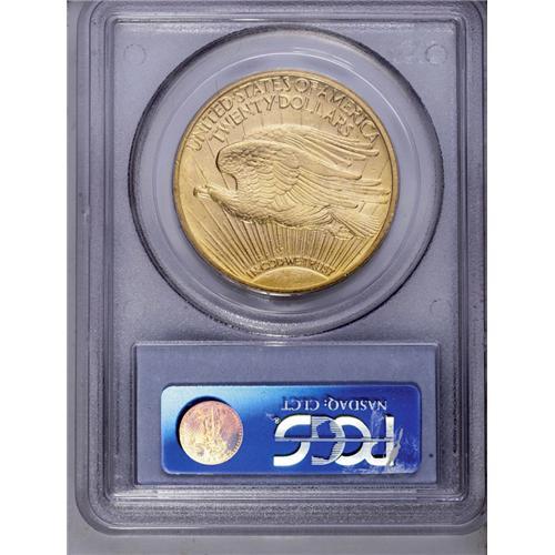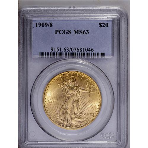 <B>1909/8<$20> MS63 PCGS.</B></I> This popular overdate representative exhibits a brassy-gold appearance with tints of light tan and bright, sparkling luster. The design elements are powerfully struck, including excellent definition on the Liberty and eagle motifs and the Capitol building. A few small contact marks on each side prevent the attainment of a higher grade designation.