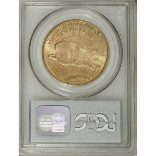<B>1909/8 $20 MS63 PCGS.</B></I> FS-301. This issue has gained fame as the only known overdate for the Saint-Gaudens double eagle series, and it has been a <I>Guide Book</B></I> staple for years, appearing on page 263 of the 2008 edition. The yellow-orange piece offered here has shimmering luster and pleasing overall detail, though a touch of softness is noted at the branch hand. The overdate is prominent as always. Light, scattered abrasions account for the grade.<BR><BR><B>Coin Engraver:</B> Augustus Saint-Gaudens<BR><BR><b>Shipping:</b> Coins & Currency (<a target="_blank" href="http://www.heritageauctions.com/common/shipping.php">view shipping information</a>\)