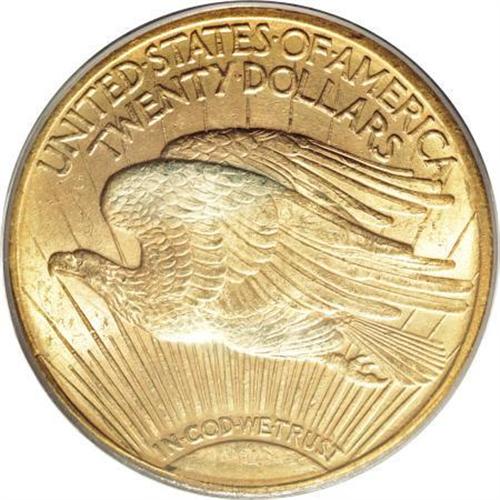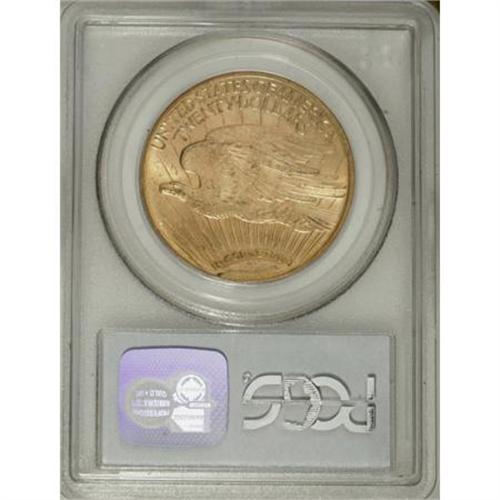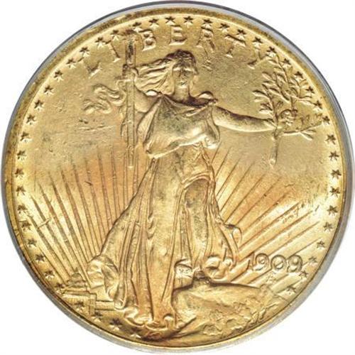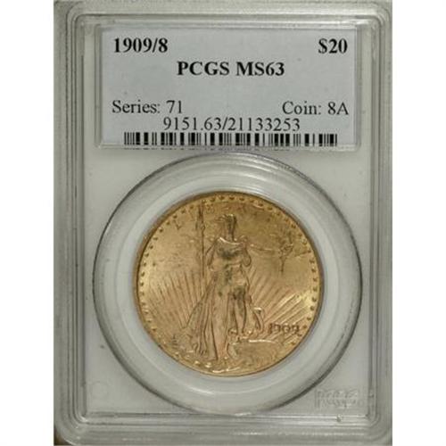 <B>1909/8 $20 MS63 PCGS.</B></I> FS-301. This issue has gained fame as the only known overdate for the Saint-Gaudens double eagle series, and it has been a <I>Guide Book</B></I> staple for years, appearing on page 263 of the 2008 edition. The yellow-orange piece offered here has shimmering luster and pleasing overall detail, though a touch of softness is noted at the torch hand. The overdate is prominent as always. Moderate abrasions on the eagle and left obverse account for the grade.<BR><I>From The Madison Collection.</B></I><BR><BR><B>Coin Engraver:</B> Augustus Saint-Gaudens<BR><BR><b>Shipping:</b> Coins & Currency (<a target="_blank" href="http://www.heritageauctions.com/common/shipping.php">view shipping information</a>)