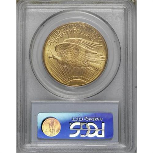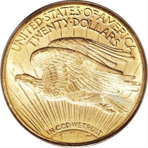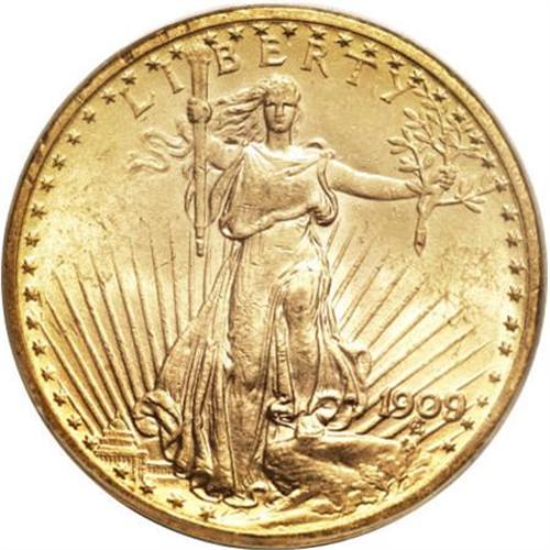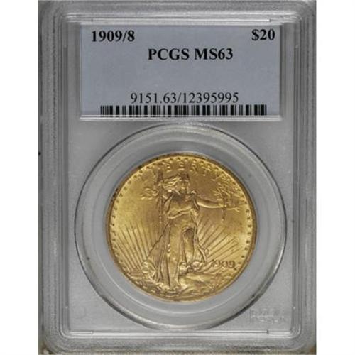 <B>1909/8 $20 MS63 PCGS.</B></I> FS-301. A radiant canary-gold representative of this scarce (and obvious) overdate. The fields and devices have surprisingly few marks, although the upper left obverse rim has distributed abrasions. The 1909/8 was caused by the consecutive use of 1908 and 1909 working obverse hubs to produce a 1909 working obverse die.<BR><BR><B>Coin Engraver:</B> Augustus Saint-Gaudens<BR><BR><b>Shipping:</b> Coins & Currency (<a target="_blank" href="http://www.heritageauctions.com/common/shipping.php">view shipping information</a>)