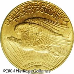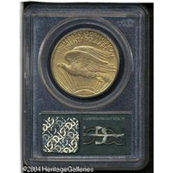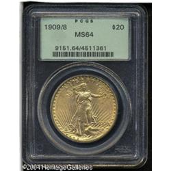 1909/8 $20 MS64 PCGS. Although not particularly ra <B>1909/8 $20 MS64 PCGS.</B></I> Although not particularly rare in lower grades, this twentieth century overdate is very scarce in Choice Uncirculated grade and is virtually unobtainable any finer. This example is dripping with orange-peel luster, and only a few scattered abrasions are present to define the grade. The sole overdate in the Saint-Gaudens Double Eagle series, this coin is extremely popular in MS64 because of the rarity of available Gem coins. Population: 59 in 64, 12 finer (10/04). <BR><BR><B>Important notice:</B> Heritage usually auctions material at the rate of 200-250 lots per hour. On some occasions eBay Live bid software or the Internet may not be able to keep up with the pace of the auction. We recommend placing a realistic absentee bid now as insurance to avoid disappointment. Occasionally the auctioneer may eliminate or reject an eBay Live bid, and the auctioneer may also reopen a lot after the close of the eBay live bidding (usually because we missed an audience bid), and may reject your bid even if it shows you as the winning bidder. By bidding via eBay Live, you agree that Heritage may award the lot to another bidder at its sole discretion under the circumstances described above or any other reasonable circumstances. Since eBay bids are not shown to us until we open the lot on the floor, we treat those bids just like floor bids. In most cases the floor responds before the eBay bid is presented to us, due to Internet lag time, so for consistency we have made it a policy that floor bids are always considered first over tie eBay live bids. Also please note that all Heritage lots purchased through eBay Live carry a 20% Buyer's Premium. Please make sure you read the Terms and Conditions before you bid. This lot is being auctioned in conjunction with a live floor auction by Heritage Galleries & Auctioneers. All final auction and invoice information will be supplied by Heritage Galleries & Auctioneers, and all other information should be considered preliminary. Lot:7095
