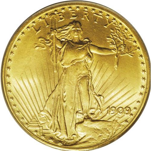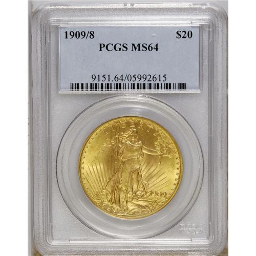 <B>1909/8 $20 MS64 PCGS.</B></I> An important overdate variety within the series of U.S. gold coinage, the 1909/8 Saint-Gaudens double eagle is one entry among an extremely limited number of 20th century overdate coins. Unlike earlier overdate varieties, all of the 20th century overdates are sharp and clearly visible. These coins are doubled hub pieces, essentially doubled dies. It is believed that just one die was involved for the 1909/8 double eagles, This near-Gem specimen has satiny yellow-gold luster with sharp design definition, and pristine, nearly mark-free surfaces. Population: 77 in 64, 18 finer (11/06).<BR><BR><b>Shipping:</b> Coin/Currency (<a target="_blank" href="http://www.heritageauctions.com/common/shipping.php">view shipping information</a>)