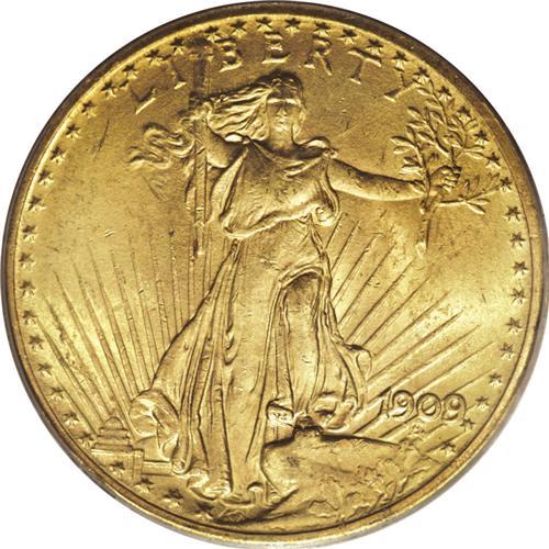 <B>1909/8 $20 MS64 PCGS.</B></I> Most examples of this overdate certified at PCGS grade a shade less than Uncirculated, 59.2 grade points to be exact. At the Choice Mint State grade level the population falls off sharply to only a few dozen pieces, with a handful finer. Created from a die in preparation that was impressed with 1908- <I>and</B></I> 1909-dated hubs between annealings, the 1909/8 overdate has remained popular ever since its "rediscovery" in the 1940s. This popularity is due, no doubt, in equal parts to the numismatic fascination with overdates in general and the collecting public's love of Augustus Saint-Gaudens' enduring design, which continues today--more or less--on the American Eagle gold coins.<BR> The present example offers lustrous orange-gold surfaces with a premium appearance, limited from a Gem grade by a few small, undistracting abrasions on Liberty's torso and in the left obverse field. Population: 77 in 64, 18 finer (2/07).<BR><BR><b>Shipping:</b> Coins & Currency (<a target="_blank" href="http://www.heritageauctions.com/common/shipping.php">view shipping information</a>)