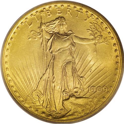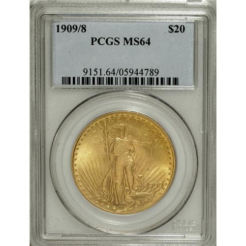 <B>1909/8 $20 MS64 PCGS.</B></I> This is an attractive example of the only overdate coin in the popular Saint-Gaudens series, and as such it sees unceasing demand from both date collectors and error specialists--this despite the existence of nearly as many overdate coins for 1909 as for nonoverdate coins. This piece offers lustrous yellow-gold surfaces that are well struck and relatively mark-free for the assigned grade. This piece becomes much more elusive only one grade point finer, and as such this near-Gem may represent an astute acquisition for some spirited bidder. Population: 81 in 64, 17 finer (3/07).<BR><BR><b>Shipping:</b> Coins & Currency (<a target="_blank" href="http://www.heritageauctions.com/common/shipping.php">view shipping information</a>)