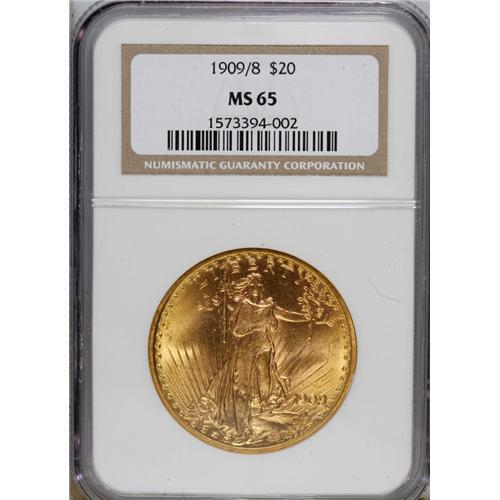 1909/8 $20 MS65 NGC. The overdate double eagle, a doub