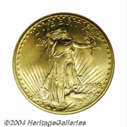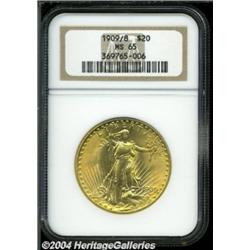 <table><tbody><tr><td><table> <TR><TD width="100%"><TABLE cellSpacing=1 cellPadding=3 width="100%" border=0><TBODY><TR><TD width="100%" bgColor=#79735c><FONT face=arial color=#ffffff size=3><B>Description</B> </FONT></TD></TR><TR><TD width="100%" bgColor=#ffffff><FONT face=arial size=2><B>1909/8 $20 MS65 NGC.</B></I> The 1909/8 has long enjoyed a place of honor in U.S. numismatics as the only overdate in the popular and widely collected Saint-Gaudens Double Eagle series. Several hundred examples surfaced in Europe in the 1960s and 1970s, but the vast majority of those coins were circulated to one degree or another. Even the coins that were Mint State, like most Uncirculated survivors in today's market, grade no finer than MS63. Gems are of the utmost rarity, and there are just 19 examples certified MS65 by NGC and PCGS combined with a mere four finer (11/03).<BR>This issue has a peculiar "look" for a P-mint Double eagle struck in 1909. Since the obverse die was leftover from the 1908 No Motto delivery, the design elements on that side are not as sharply detailed as those on the 1909 perfect date examples. However, we stress that this lovely Gem possesses ample evidence of having received a powerful strike from the dies. Both sides are fully lustrous with a rich, frosty texture that highlights the undeniably original yellow-gold coloration. We are hard pressed to find more than one or two scattered bagmarks on both the obverse and the reverse, but, if we had to select a pedigree marker, we would use the vertical abrasion on Liberty's right (facing) knee. We cannot overstate the importance of the present lot among advanced gold specialists, and this coin that is fully deserving of a premium quality bid. Population: 9 in 65, 3 finer (11/03).<BR><I>From a Magnificent Collection of Double Eagles.</B></I> </FONT></TD></TR></TBODY></TABLE></TD></TR></TBODY></TABLE><BR><A name=PricesRealized></A><TABLE cellSpacing=0 cellPadding=0 width="100%" bgColor=#000000 border=0><TBODY><TR><TD width="100%"><TABLE cellSpacing=1 cellPadding=3 width="100%" border=0><TBODY><TR><TD width="100%" bgColor=#79735c><A name=PR><FONT face=arial color=#ffffff size=3><B>Previous Prices from Heritage Auctions</B> </FONT></A></TD></TR><TR><TD bgColor=#f6f6ed><TABLE cellSpacing=0 cellPadding=0 width="100%" border=1><TBODY><TR><TD align=middle width="33%"><B>Date</B></TD><TD align=middle width="33%"><B>Service</B></TD><TD align=middle width="33%"><B>Price</B></TD></TR><TR bgColor=whitesmoke><TD width="33%"><B>01/05/2001</B></TD><TD width="33%">PCGS</TD><TD width="33%">$17,250.00</TD></TR><TR bgColor=whitesmoke><TD width="33%"><B>09/01/1997</B></TD><TD width="33%">PCGS</TD><TD width="33%">$25,300.00</TD></TR></TBODY></TABLE></TD></TR><TR><TD bgColor=#ffffff><FONT face=arial size=1 ?>PLEASE NOTE: All prices realized reflect the final hammer price PLUS the buyer's premium in auctions that charge a buyer's premium. Each item has a notation at the top of the listing indicating whether that lot included a buyer's premium. Example: A item that sells with a final hammer price of $100 and a 20% buyer's premium will display with a price realized of $120. All information listed is intended to be as accurate as possible, but errors are possible. Please use this guide carefully and inform us of any inaccuracies. </FONT></TD></TR></TBODY></TABLE></TD></TR></TBODY></TABLE><BR><TABLE cellSpacing=0 cellPadding=0 width="100%" bgColor=#000000 border=0><TBODY><TR><TD width="100%"><TABLE cellSpacing=1 cellPadding=3 width="100%" border=0><TBODY><TR><TD width="100%" bgColor=#79735c colSpan=6><FONT face=arial color=#ffffff size=3><B>Price Guide*</B> </FONT></TD></TR><TR bgColor=#f6f6ed><TD align=middle><B>Grade</B> </TD><TD align=middle><B>Coin World<BR>(Trends)</B> </TD><TD align=middle><B>Numismedia<BR>Retail</B> </TD><TD align=middle><B>Numismedia<BR>Wholesale</B> </TD><TD align=middle><B>Coin<BR>Universe</B> </TD><TD align=middle><B>Heritage<BR>Value Index</B> </TD></TR><TR bgColor=#ffffff><TD align=middle>64</TD><TD align=right>$16,000.00</TD><TD align=right>---</TD><TD align=right>$12,500.00</TD><TD align=right>$17,500.00</TD><TD align=right>$11,836.25</TD></TR><TR style="FONT-WEIGHT: bold" bgColor=#cccfdd><TD align=middle>65</TD><TD align=right>$35,000.00</TD><TD align=right>---</TD><TD align=right>$23,650.00</TD><TD align=right>$40,000.00</TD><TD align=right>$24,183.75</TD></TR><TR bgColor=#ffffff><TD align=middle>66</TD><TD align=right>$60,000.00</TD><TD align=right>---</TD><TD align=right>---</TD><TD align=right>---</TD><TD align=right>$95,000.00</TD></TR><TR bgColor=#ffffff><TD colSpan=6><FONT size=1>*All information listed is intended to be as accurate as possible, but errors are possible. No item may be returned or refused based on this information which is provided as a service to our customers. You should contact each pricing source directly to determine the accuracy of this information. </FONT></TD></TR></TBODY></TABLE></TD></TR></TBODY></TABLE><BR><TABLE cellSpacing=0 cellPadding=0 width="100%" bgColor=#000000 border=0><TBODY><TR><TD width="100%"><TABLE cellSpacing=1 cellPadding=3 width="100%" border=0><TBODY><TR><TD width="100%" bgColor=#79735c><FONT face=arial color=#ffffff size=3><B>Population Guide</B> </FONT></TD></TR><TR bgColor=#ffffff><TD align=middle><!-- Begin Output of Population Grid--><TABLE cellSpacing=0 cellPadding=0 width="100%" border=0><TBODY><TR><TD vAlign=center><TABLE cellSpacing=0 width="100%" border=1 cellsadding="3"><TBODY><TR><TD vAlign=center><TABLE cellSpacing=0 cellPadding=3 width="100%" border=1><TBODY><TR><TD vAlign=center align=middle bgColor=#f0f1e8 colSpan=2 <CENTER><FONT face=Arial size=2><B>PCGS Pop </B></FONT><CENTER></CENTER></TD><TD vAlign=center align=middle bgColor=#f0f1e8 colSpan=2><CENTER><FONT face=Arial size=2><B>NGC Pop</B></CENTER></FONT></TD></TR><TR><TD vAlign=center><FONT face=Arial size=2>(65)</FONT> </TD><TD vAlign=center align=right><FONT face=Arial size=2>10</FONT> </TD><TD vAlig