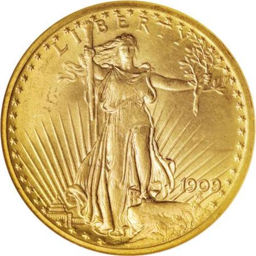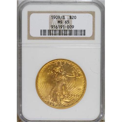 <B>1909/8 $20 MS65 NGC.</B></I> The 1909/8 has long enjoyed a place of honor in U.S. numismatics as the only overdate in the popular and widely collected Saint-Gaudens Double Eagle series. Several hundred examples surfaced in Europe in the 1960s and 1970s, but the vast majority of those coins were circulated to one degree or another. Even the coins that were Mint State, like most Uncirculated survivors in today's market, grade no finer than MS63. Gems are of the utmost rarity, and there are just 23 examples certified MS65 by NGC and PCGS combined, with a mere 10 finer (3/07).<BR> This issue has a peculiar "look" for a P-mint double eagle struck in 1909. Since the obverse die was leftover from the 1908 No Motto series, the design elements on that side are not as sharply detailed as those on the 1909 perfect date examples. However, we stress that this lovely Gem possesses ample evidence of having received a powerful strike from the dies. Both sides are fully lustrous with a rich, frosty texture that highlights the rich orange-gold coloration. We are hard pressed to find more than one or two scattered bagmarks on both the obverse and the reverse; but, if we had to select a pedigree marker, we would use a horizontal scuff at the top of the sun on the reverse. We cannot overstate the importance of the present lot among advanced gold specialists, and this coin that is fully deserving of a premium quality bid. Census: 9 in 65, 7 finer (5/07).<BR><BR><b>Shipping:</b> Coins & Currency (<a target="_blank" href="http://www.heritageauctions.com/common/shipping.php">view shipping information</a>)