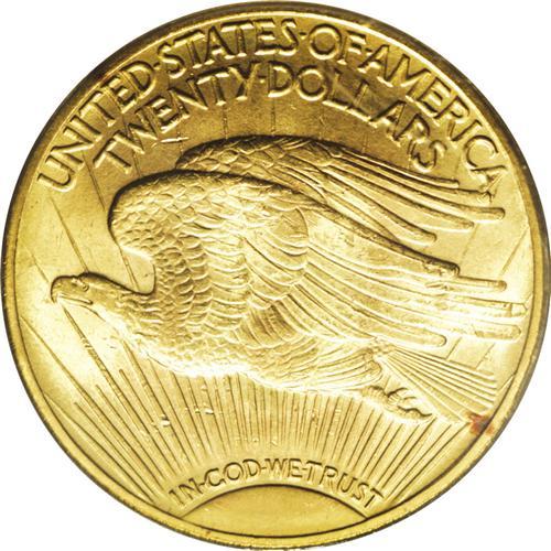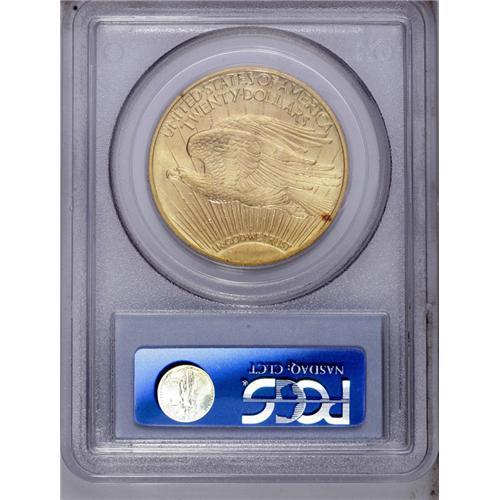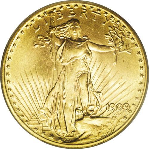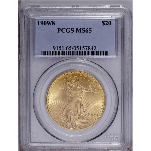 <B>1909/8<$20> MS65 PCGS.</B></I> The only overdate in the Saint-Gaudens series, the 1909/8 is a popular issue that is also of considerable rarity at the present level of preservation. The obverse die was a holdover from the 1908 No Motto issue, and most representatives of this overdate variety are softly defined over Liberty's portrait. On the other hand, this coin is well struck throughout with whirlpool luster effects. The surfaces exhibit a rich, frosty texture, and there are no abrasions of note. For pedigree purposes, a single copper-colored toning spot is seen at the intersection of the eagle's tail and the reverse rim. A reddish-gold Gem that offers both condition rarity and superior eye appeal. Population: 11 in 65, 2 finer (1/06).