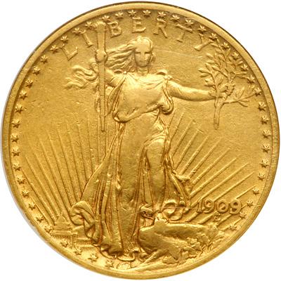 1909/8 $20. NGC graded VF-35. Appealing golden toning. Relatively even wear. Only 161,282 struck.