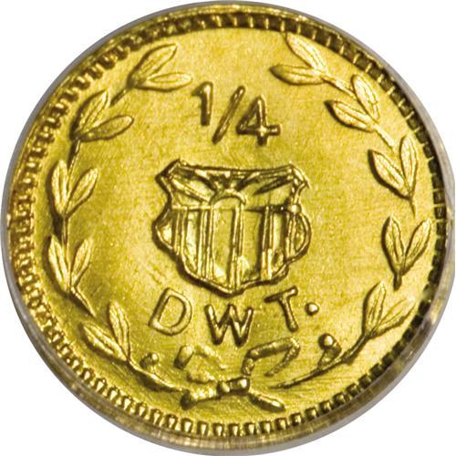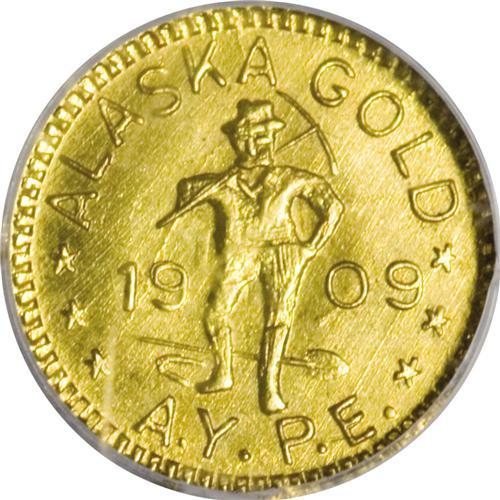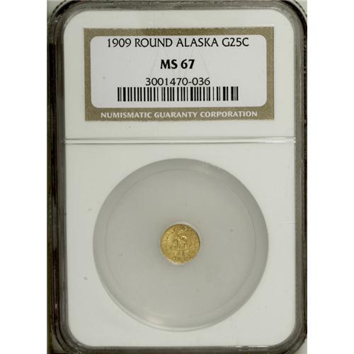 <B>1909 Alaska Gold 1/4 DWT Token MS67 NGC.</B></I> Type of GB-170. Obverse: Standing miner with pick and shovel, with legends ALASKA GOLD 1909 A.Y.P.E. Reverse: Shield within wreath, with legend 1/4 DWT. Struck by M.E. Hart for the Alaska Yukon Pacific Exposition. A satiny Superb Gem, essentially as made.<BR><BR><b>Shipping:</b> Coin/Currency (<a target="_blank" href="http://www.heritageauctions.com/common/shipping.php">view shipping information</a>)