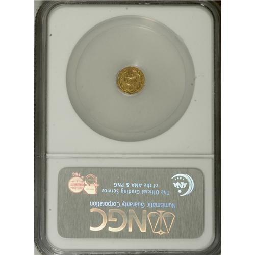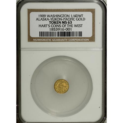 <B>1909 Alaska Gold A.Y.P.E. 1/4 DWT MS63 NGC.</B></I> Gould-Bressett 168. From Hart's "Coins of the West" series. Offered at the Alaska Yukon Pacific Exposition. An unperturbed olive-gold piece with a typical strike and an original, attractive appearance.<BR><I>From The Twin Hollows Collection, Part Two.</B></I><BR><BR><b>Shipping:</b> Coins & Currency (<a target="_blank" href="http://www.heritageauctions.com/common/shipping.php">view shipping information</a>)