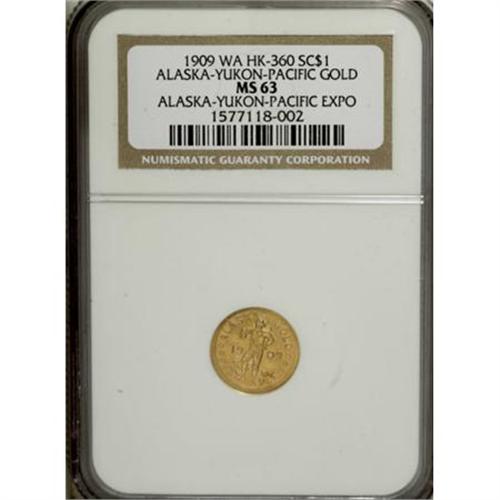 <B>1909 Alaska Gold A.Y.P.E. 1 DWT MS63 NGC.</B></I> HK-360, Gould-Bressett 154. A lovely khaki-gold representative that benefits from clean fields and boldly delivered motifs.<BR><BR><b>Shipping:</b> Coins & Currency (<a target="_blank" href="http://www.heritageauctions.com/common/shipping.php">view shipping information</a>)